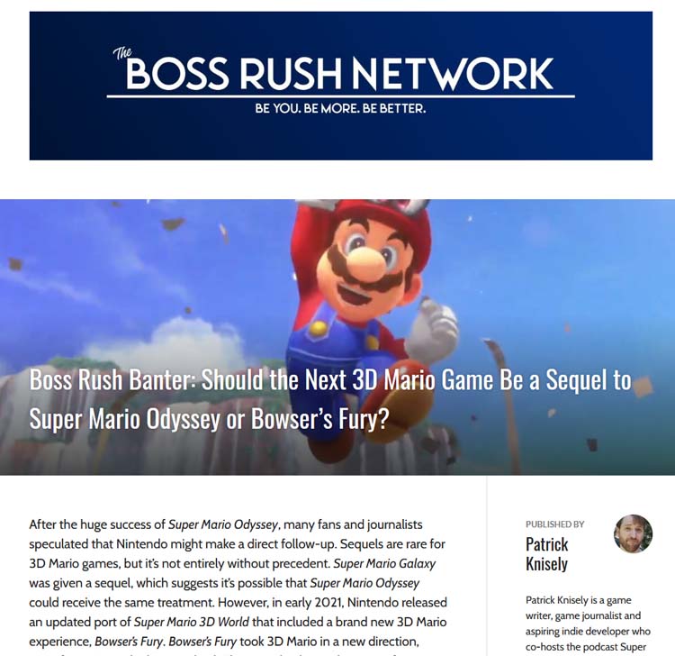 Starting in the summer of 2021, I began writing for the Boss Rush Network website, writing gaming news articles, editorials and reviews. In addition I regularly write Boss Rush Banter pieces, a daily featured segment on the website focusing on an open-ended question. In addition I’ve been covering gaming news regularly on my podcast Super Switch Headz since early 2019.